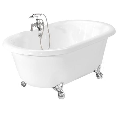 T070B-CH Finish: Chrome Pictured in chrome Bath tub package includes: -Small ball and claw feet. -90 Series faucet. -Hand shower and metal cross handles. -Waste, overflow and supply lines. Features: -Bath tub. -Melinda collection. -Faucet and accessories available in: -Chrome finish. -Old world bronze finish. -Satin nickel finish. -White finish. . -Tub: White color. -AcraStone construction. -Double ended style. -Bathtub with chrome faucet available in white small ball and claw feet. -Predrilled overflow and drain holes. Specifications: -Made in USA. -Capacity: 42 Gallons. -American Bath Factory provides limited lifetime warranty. -Overall dimensions: 24'' H x 32'' W x 60'' D. Read more...